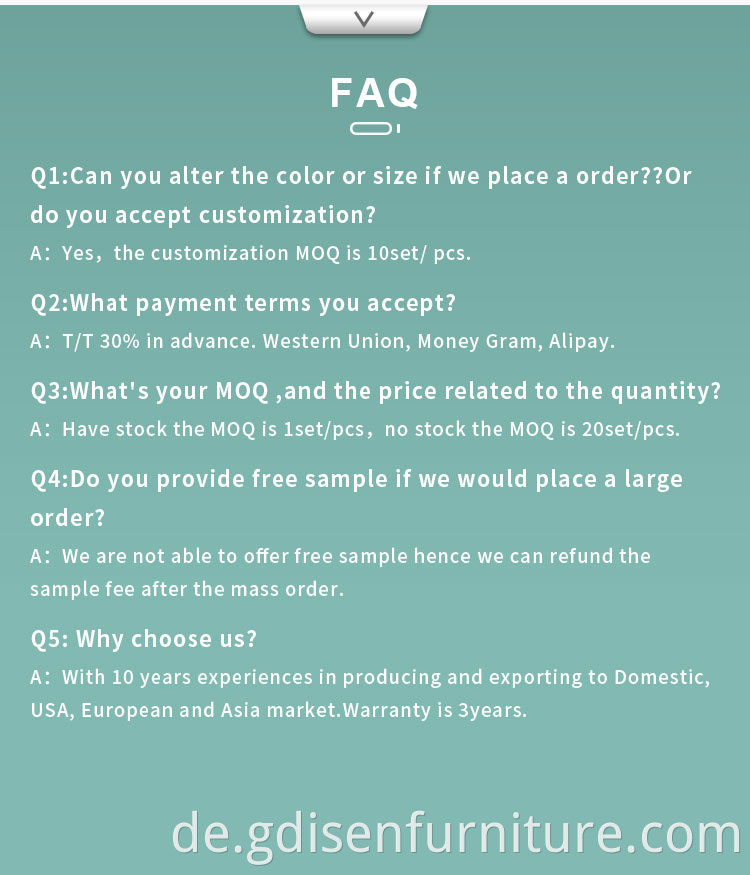 Wir besaßen ein Team von Forschung und Entwicklung mit professionellem Wissen mit der Gestaltung moderner Möbel. Wenn wir einen neuen Artikel erhalten, werden wir zuerst die Kosten für die Produkte schätzen und dann versuchen, einen Plan für die Produktion zu machen, um einen Gewinn für einander zu erzielen. Wir werden die Techniken mit Kunden diskutieren. OEM -Design von Kunden sind willkommen.